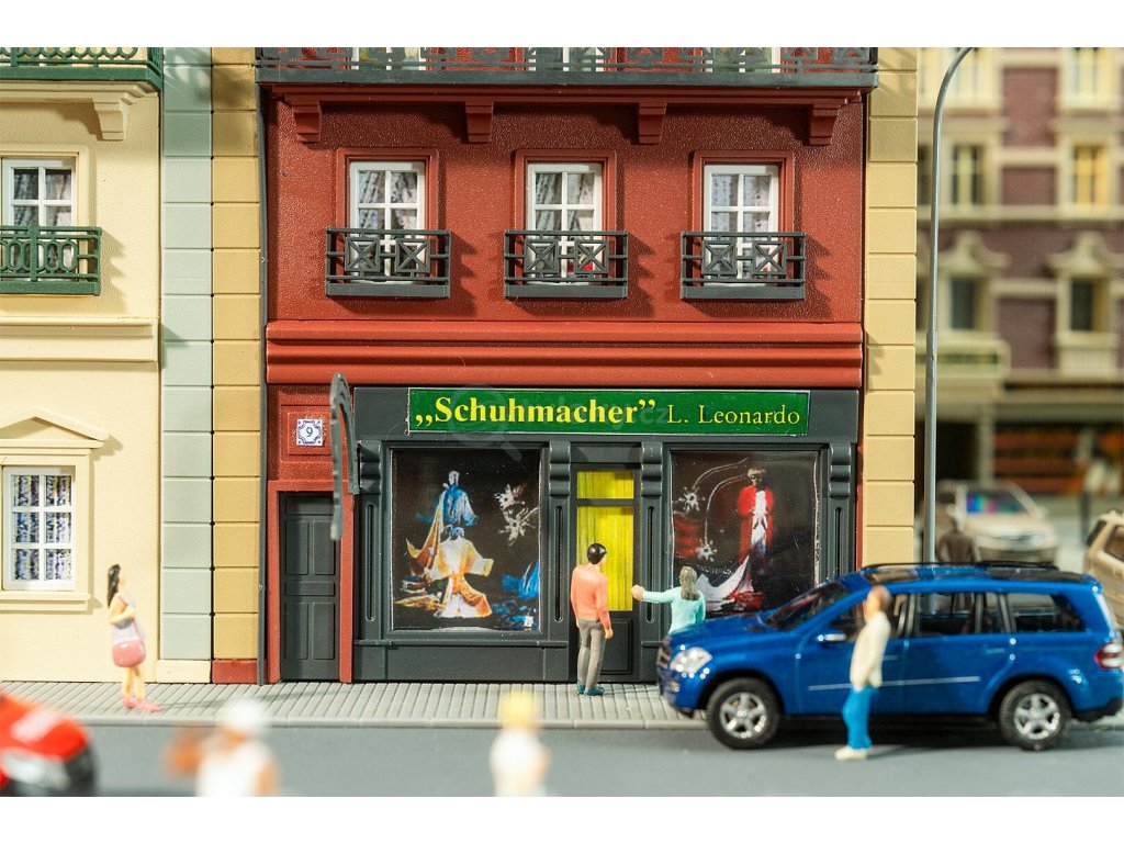 Tento typický rezavě červený městský dům, který se rozkládá na čtyřech patrech, zaujme elegantním černým kovovým zábradlím a ševcovskou dílnou v přízemí. Je to perfektní doplněk jakékoli řady domů a obohatí vaši miniaturní městskou krajinu okouzlujícím městským nádechem.