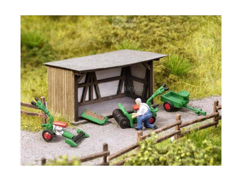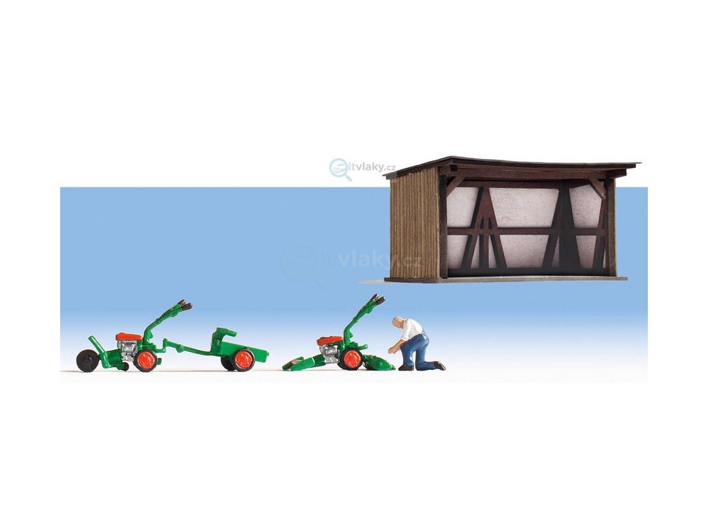 H0 - kůlna a sekačky na trávu, figurka, na venkově / NOCH 12041