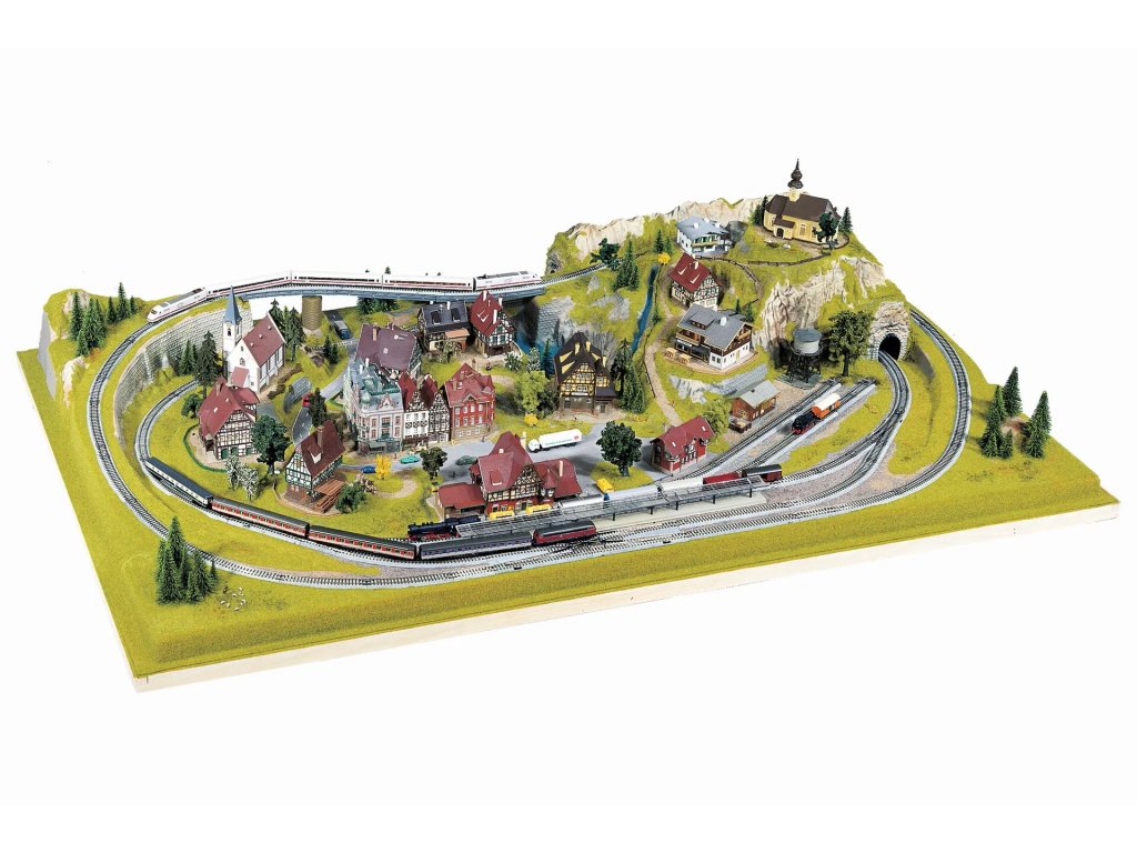 Ein Idyll im besten Modellbahnformat bietet das Fertiggelände "Königsfeld". Die interessant geführte Gleisstrecke verläuft durch eine Mittelgebirgslandschaft mit vielen Sehenswürdigkeiten: eine mittelalterliche Kleinstadt mit Kirche, ein Berg mit Burg, ein Bachlauf mit Badesee (für fließendes Wasser geeignet), ein alter Backstein-Bahnhof mit Güterschuppen und nicht zuletzt ein Tunnel und eine schön geschwungene Brücke. Zwei Bahnstromkreise und ein Abstellgleis erlauben interessanten Bahnbetrieb.