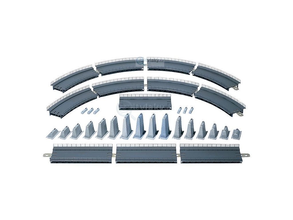 Tato sada obsahuje: 4 rovná a 8 zakřivených kolejových loží, po 2 sloupcích 15, 25, 35, 45, 55 a 65 mm, 4 sloupky 75 mm, 6 hlavic sloupků 8 mm pro rozšíření na výškový rozměr mostů FALLER a spojovací oka pro kolejová lože. Kolejová lože jsou vhodná pro uložení modelových a C-kolejnic. K dispozici jsou přídavné pilíře (obj. 120473), rovná kolejová lože (obj. 120474) a zakřivená kolejová lože (obj. 120476) pro rozšíření rampy nahoru nebo dolů.