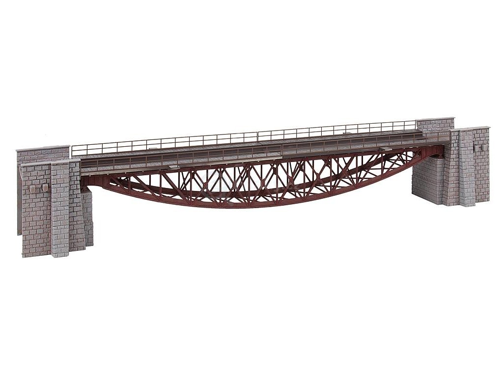 Ocelový most s přímým kolejovým ložem, trámem s rybím břichem směrem dolů a zděnými hlavami mostu. Vhodný pro všechna modelová kolejiště.