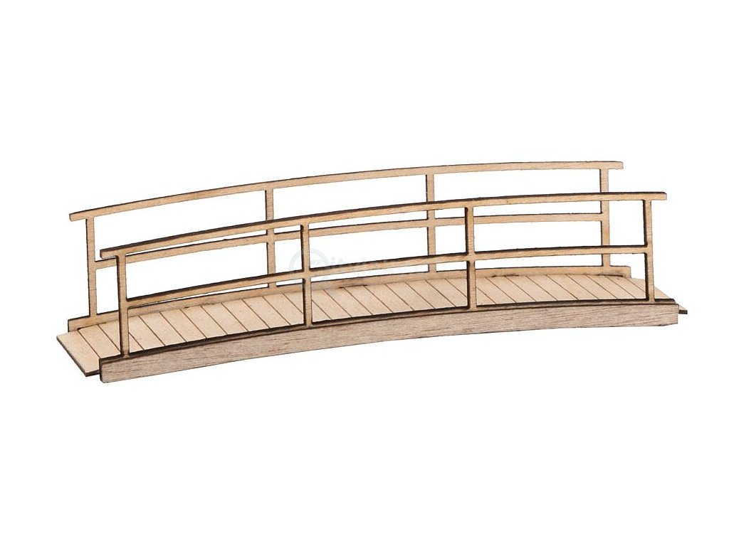 Laserem vyřezávaný model zakřiveného dřevěného jezírka a zahradního mostu.
