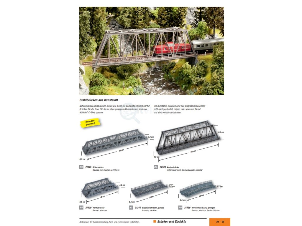 S ocelovými mosty NOCH vám nabízíme kompletní řadu mostů pro rozchod HO, které lze použít se všemi běžnými kolejovými systémy. Plastové můstky jsou po originálech realistické, vykazují velký důraz na detail a snadno se montují. Ať už na strmých svazích, při překonávání řek nebo potoků nebo při překonávání hlubokých roklí: ocelové mosty lze jednotlivě použít v mnoha krajinných scénách. Díky jednoduché konstrukci a detailnímu vzhledu dávají mosty každé krajině opravdový poutač a lze je jen stěží rozeznat od skutečnosti. Rovná mostovka je vhodná pro trasy bez oblouků, kde krajinou projíždí model železniční vláčky. Využijte všestrannost ocelových mostů od NOCH ve své modelové krajině a zahrňte realistické scény.