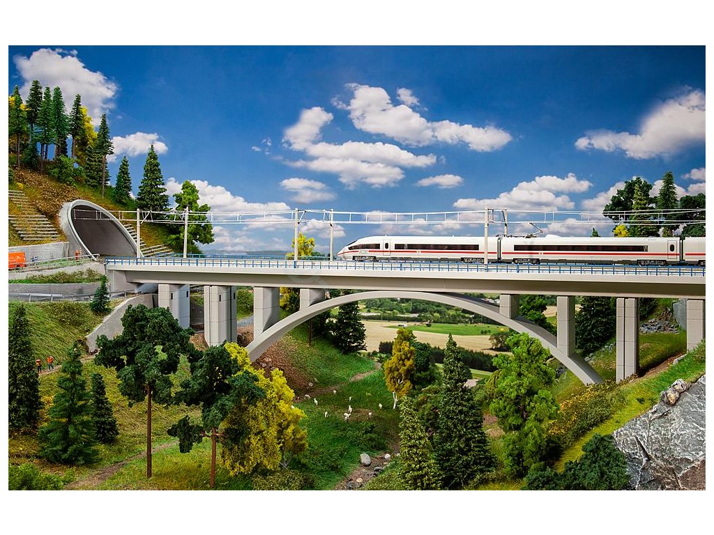 Fascinující konstrukce mostu! Moderní betonový obloukový most širokého rozpětí se dvěma sousedními mostními poli a opěrami ve stylu durynského mostu Rehtal. Lze použít na 2 kolejištích a pro všechna modelová kolejiště.