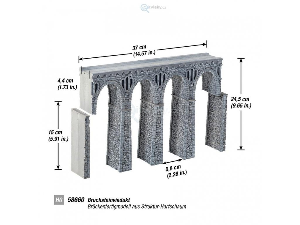 „Viadukt z lomového kamene“ je ideální pro stavbu obzvláště dlouhých a impozantních mostních konstrukcí. „Viadukt z lomového kamene“ lze ideálně kombinovat s různými modelovými stěnami a arkádami. Viadukt dodává krajinné scenérii velmi osobitý a neobvyklý vzhled. Vlak jede přes viadukt a máte krásný výhled na krajinu pod sebou. Ostatní účastníci silničního provozu, jako jsou automobily, nákladní automobily, traktory, motocyklisté a mnoho dalších, si projíždějí otisky viaduktu. Vytvořte si vlastní krajinnou scenérii s „kamenným viaduktem Rubble Stone Viaduct“ ještě realističtěji a přidejte do svého návrhu skvělé detaily.
