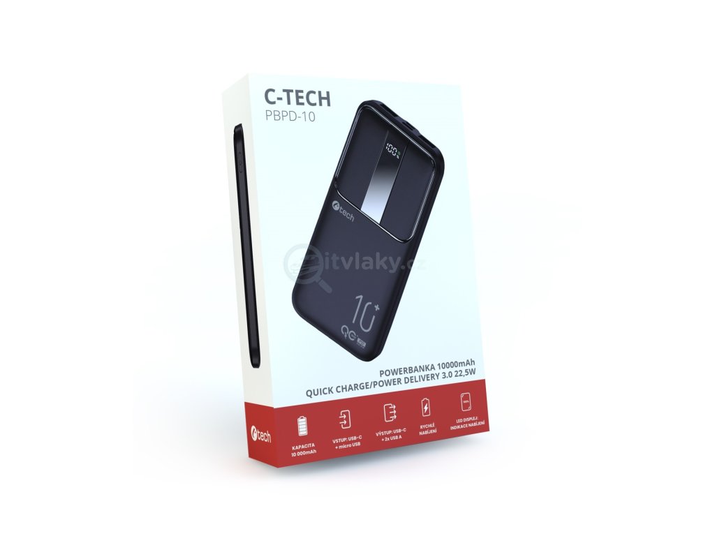 C-TECH Powerbanka 10 000 mAh, displej, USB, USB-C, mikro USB / C-TECH