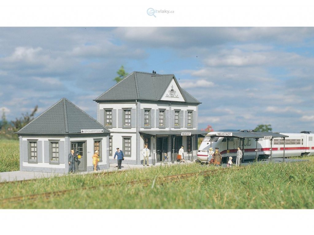 Hlavní staniční budova NEUSTADT k zahradní železnici. Nástupiště ani další budovy nejsou součástí.
