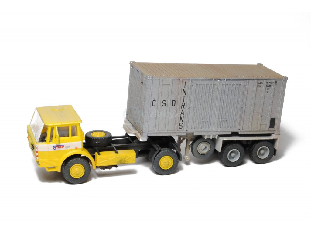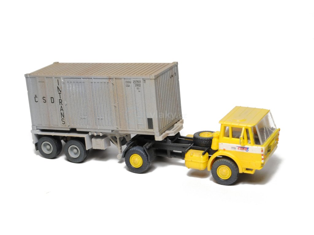 Kompletní plastiková stavebnice Tatry 813 4×4 NT a návěsu HLS 200.78/T s kontejnerem Gtt 3. Obsahuje probarvené plastikové výlisky na sestavení modelů, kovové osičky a sadu obtisků.