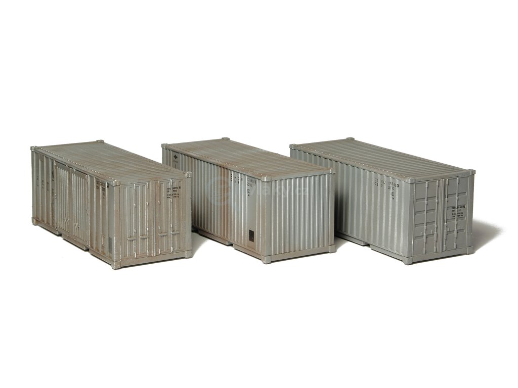 Kompletní stavebnice 3 přepravních kontejnerů. Obsahuje probarvené plastikové výlisky a obtiskový aršík s nápisy na 3 různé kontejnery přepravce ČSKD Intrans. IV.-VI. epocha.