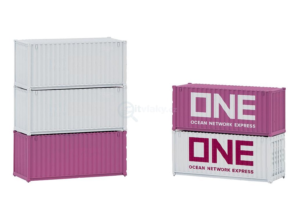 Sada 5 sad 20' kontejnerů. Dva modely s digitálním potiskem označení společnosti "ONE". Barvy: 3 x bílá, 2 x purpurová.