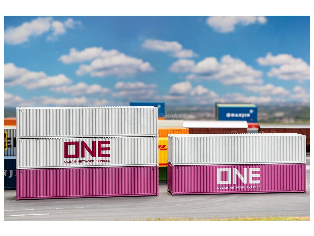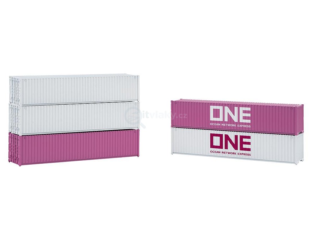 Sada 5 ks 40' kontejnerů. Dva s digitálním potiskem označení společnosti "ONE". Barvy: 3 x bílá, 2 x purpurová.