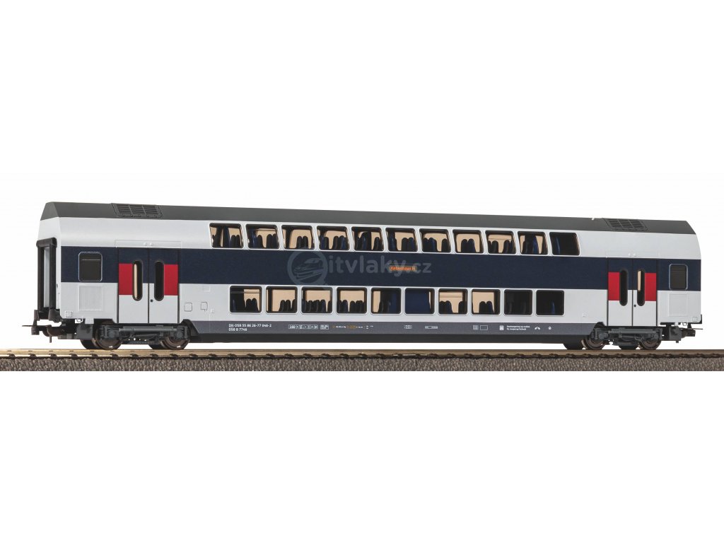 Novinka 2023: Verze patrových vozů v provedení DSB v éře VI v modrobílém nátěru s červenými dveřmi. Modely patrových vozů se vyznačují přesnou reprodukcí všech důležitých detailů předlohy a jemným lakováním a potiskem. Ostře vyryté repliky podvozků a samostatně vložená okna podtrhují typický vzhled těchto nápadných vozů.