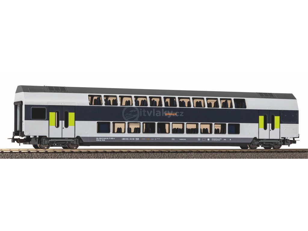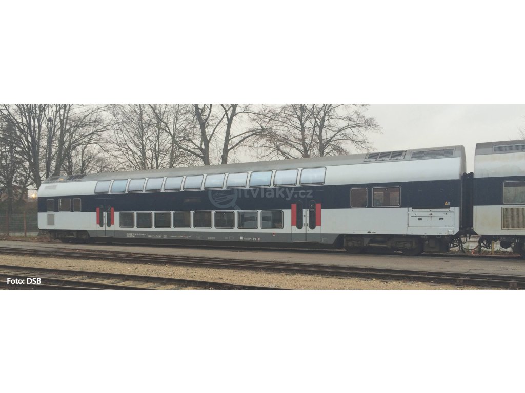 Novinka 2023: Verze patrových vozů v provedení DSB v éře VI v modrobílém nátěru se zelenými dveřmi. Modely dvoupatrových vozů se vyznačují přesnou reprodukcí všech důležitých detailů předlohy a jemným malováním a tiskem. Ostře vyryté repliky podvozků a samostatně vložená okna podtrhují typický vzhled těchto nápadných vozů.