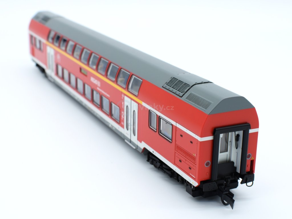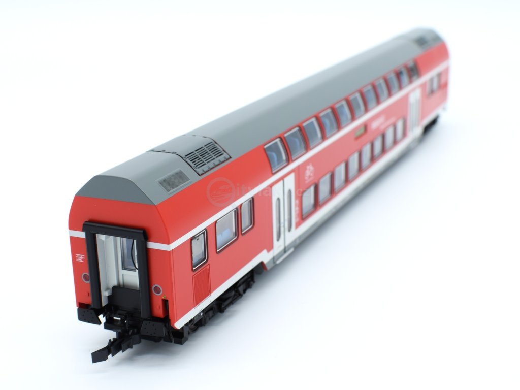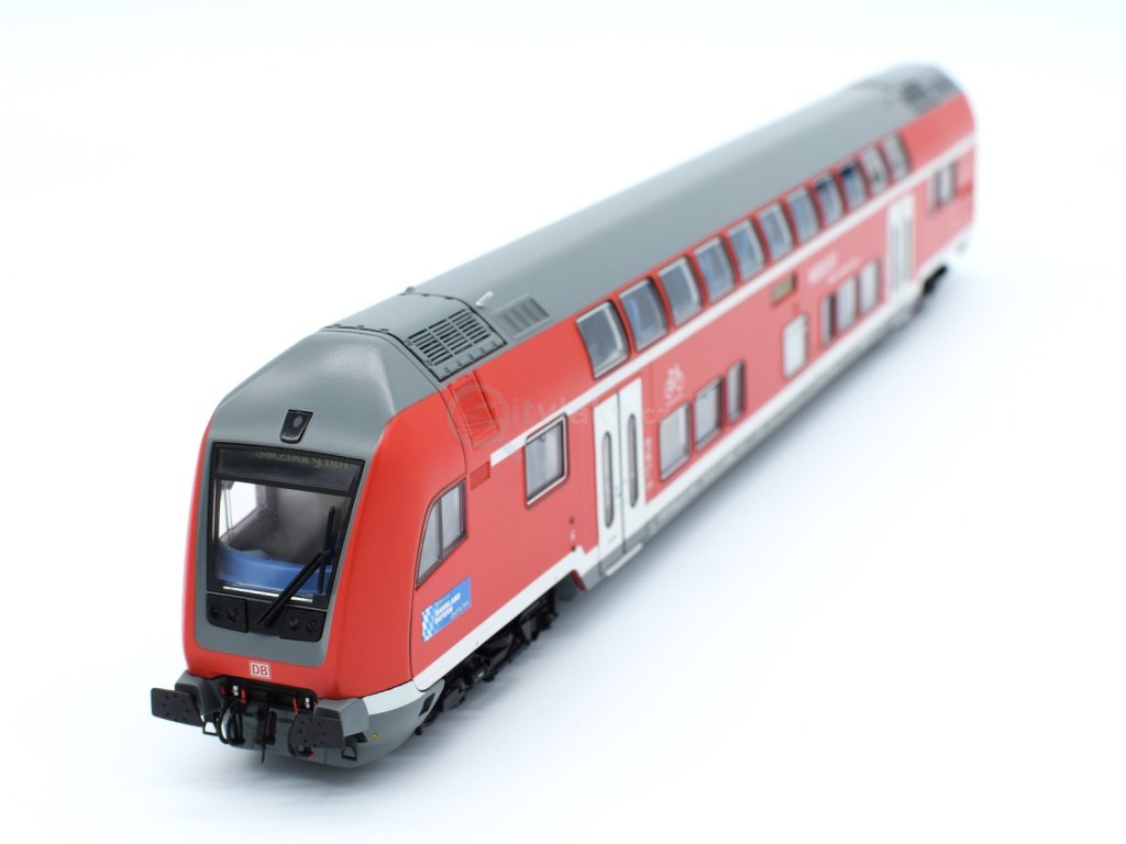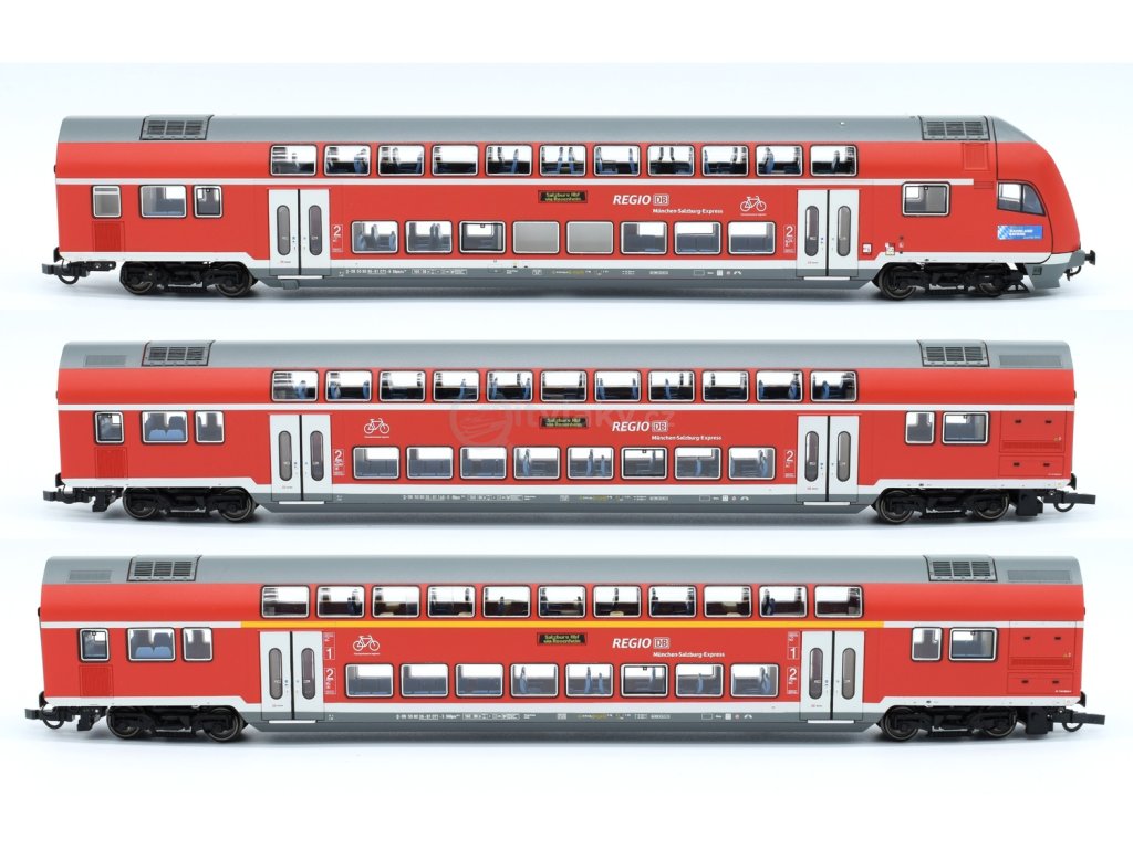 3 piece set: Double-deck coaches, DB AGWagenset mit drei Doppelstockwagen der Deutschen Bahn. Bestehend aus einem Doppelstockwagen 2. Klasse, Gattung DBpza, einem Doppelstockwagen 1./2. Klasse, Gattung DABdpza und einem Doppelstock-Steuerwagen 2. Klasse, Gattung DBpbzfa. ■ Ausführung als München-Salzburg Express ■ Steuerwagen mit digtial schaltbaren Spitzen-, Schluss- und Fernlicht, Führerstandsbeleuchtung und Zugzielanzeige ■ Alle Wagen mit perfekt auf das Modell angepasster LED-Innenbeleuchtung für eine optimale Ausleuchtung ■ Gleichstromversion