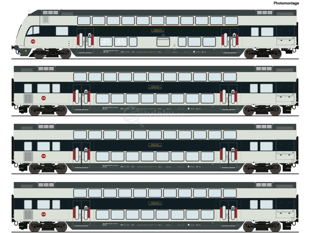 4 piece set: Double-deck coaches, DSBWagenset mit vier Doppelstockwagen der Dänischen Staatsbahnen. Bestehend aus zwei Doppelstockwagen 2. Klasse, Gattung B, einem Doppelstockwagen 2. Klasse, Gattung Bk und einem Doppelstock-Steuerwagen 1./2. Klasse, Gattung ABs. ■ Steuerwagen mit korrekten Bauartunterschieden ■ Wagen der Bauart Bk mit Servicebereich ausgestattet ■ Steuerwagen mit digtial schaltbaren Spitzen-, Schluss- und Fernlicht, Führerstandsbeleuchtung und Zugzielanzeige ■ Alle Wagen mit perfekt auf das Modell angepasster LED-Innenbeleuchtung für eine optimale Ausleuchtung ■ Gleichstromversion