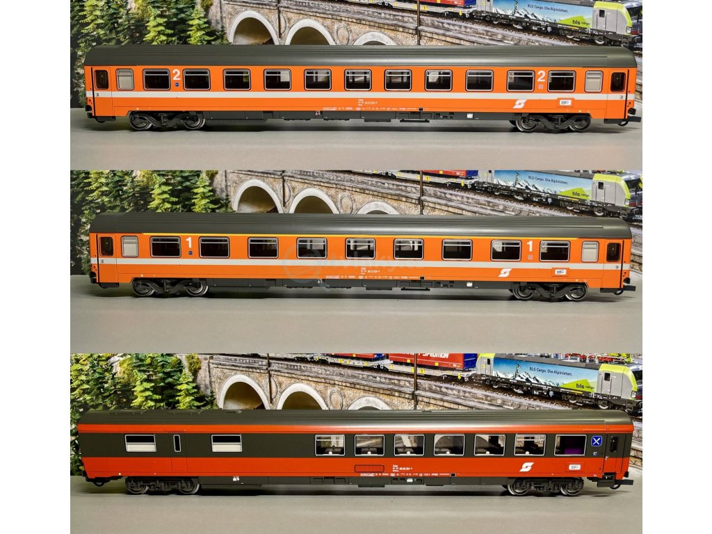 Wagenset 2 mit drei Eurofima-Schnellzugwagen für den Eurocity 60 „Maria Theresia“ der Österreichischen Bundesbahnen.