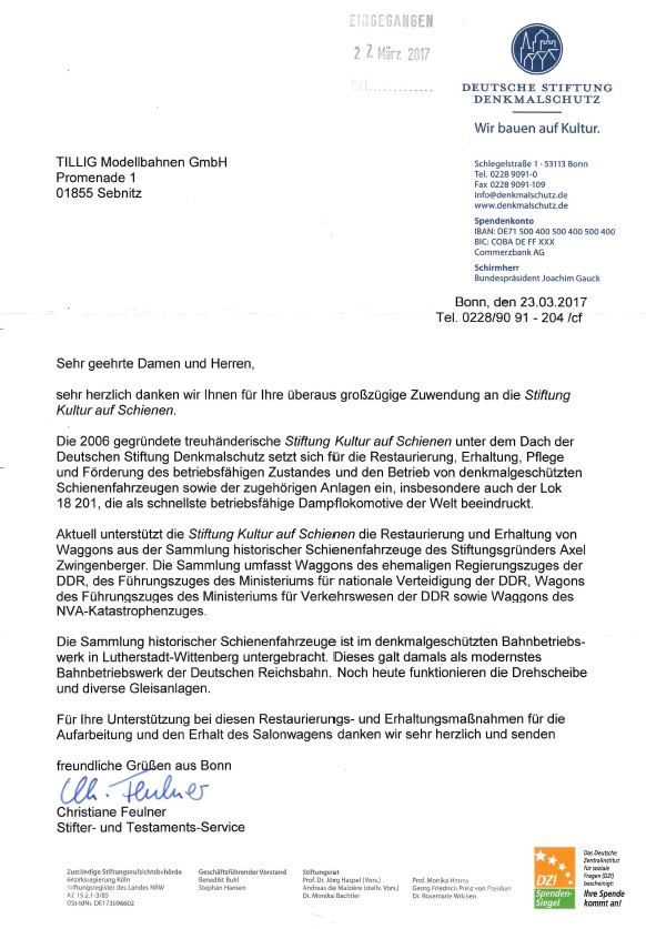 | Spendenübergabe Spielwarenmesse 2018 in Nürnberg: | Schreiben Stiftung "Kultur auf Schienen" | |
