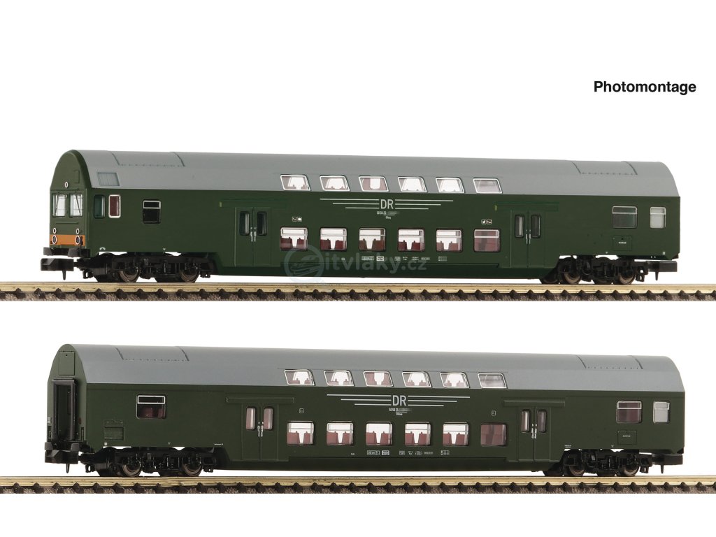 Wagenset 1 mit zwei Doppelstockwagen der Deutschen Reichsbahn. Bestehend aus einem Doppelstockwagen 2. Klasse, Gattung DBmue und einem Doppelstock-Steuerwagen 2. Klasse, Gattung DBmq. ■ Steuerwagen mit Lichtwechsel weiß/rot ■ Passend zu Doppelstockwagenset, Art.-Nr. 6260042 1971 lieferte der VEB Waggonbau Görlitz zwei Prototypen des Doppelstock-Einzelwagen an die DR. Von den Doppelstock-Einzelwagen versprach man sich flexiblere Anpassungen an wechselnde Fahrgastaufkommen sowie Einsparungen bei Beschädigungen. Nach der ausgiebigen Erprobung der zwei Prototypen wurde ab 1974 eine erste Serie von rund 138 Fahrzeugen geliefert. Der Unterstock war bei diesen Wagen vollständig mit Sitzplätzen ausgestattet. Der Einsatz erfolgte zuerst in den südlichen Ballungszentren und Strecken mit hohem Verkehrsaufkommen.