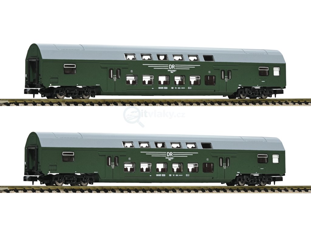Souprava 2 se dvěma dvoupatrovými vozy, typ DBmue, železniční společnosti Německé demokratické republiky (Deutsche Reichsbahn).