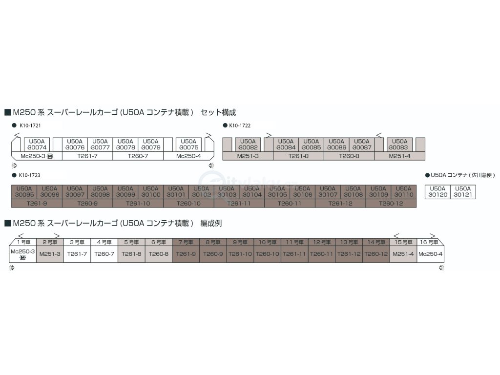 Čtyřdílný kontejnerový elektrický jednotkový vlak M250 „Super Rail Cargo“ představuje unikátní vysokorychlostní nákladní soupravu společnosti JR Freight (JRF). Model zachycuje charakteristický aerodynamický design, dvoudílné čelní vozy a kontejnerové mezivozové jednotky. Souprava odpovídá provoznímu stavu epoch V–VI a vyznačuje se detailním provedením skříní, podvozků i kontejnerových plošin. Vlak je určen pro rychlou přepravu kontejnerů na tratích s vysokou propustností.