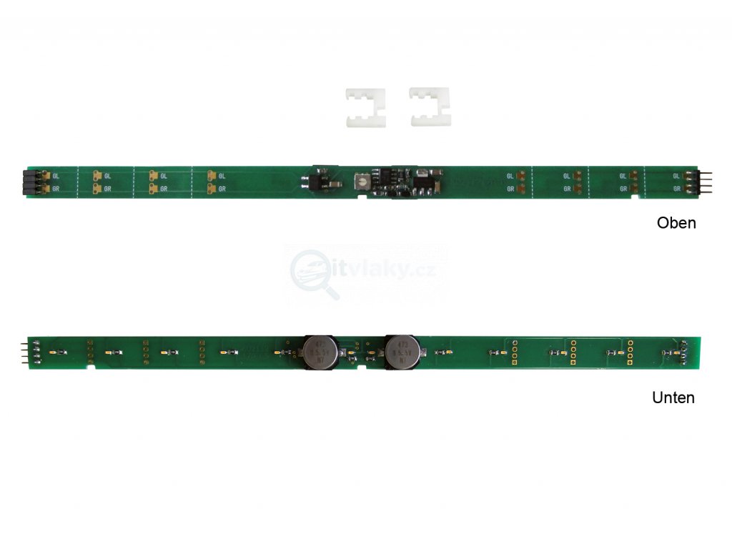 Univerzální deska plošných spojů s několika LED diodami pro dovybavení většiny osobních vozů ze sortimentu Märklin H0. Vestavěná vyrovnávací paměť umožňuje provoz bez blikání. Jas vnitřního osvětlení lze nastavit ručně. Desku plošných spojů lze na několika místech zkrátit pro kratší vozy. Součástí dodávky jsou držáky pro montáž na vnitřní vybavení.