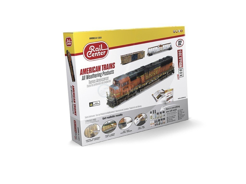 Sada SOLUTION BOX od AMMO vám nabízí vše, co potřebujete k realistickému malování a zestárnutí amerických vlaků všech dob. Tato sada neobsahuje jen přesné odstíny a produkty proti povětrnostním vlivům. Tato komplexní 96stránková příručka poskytuje podrobné pokyny ve čtyřech jazycích (němčině, angličtině, španělštině a francouzštině) a vysvětluje, jak aplikovat různé barvy a efekty na americká kolejová vozidla.