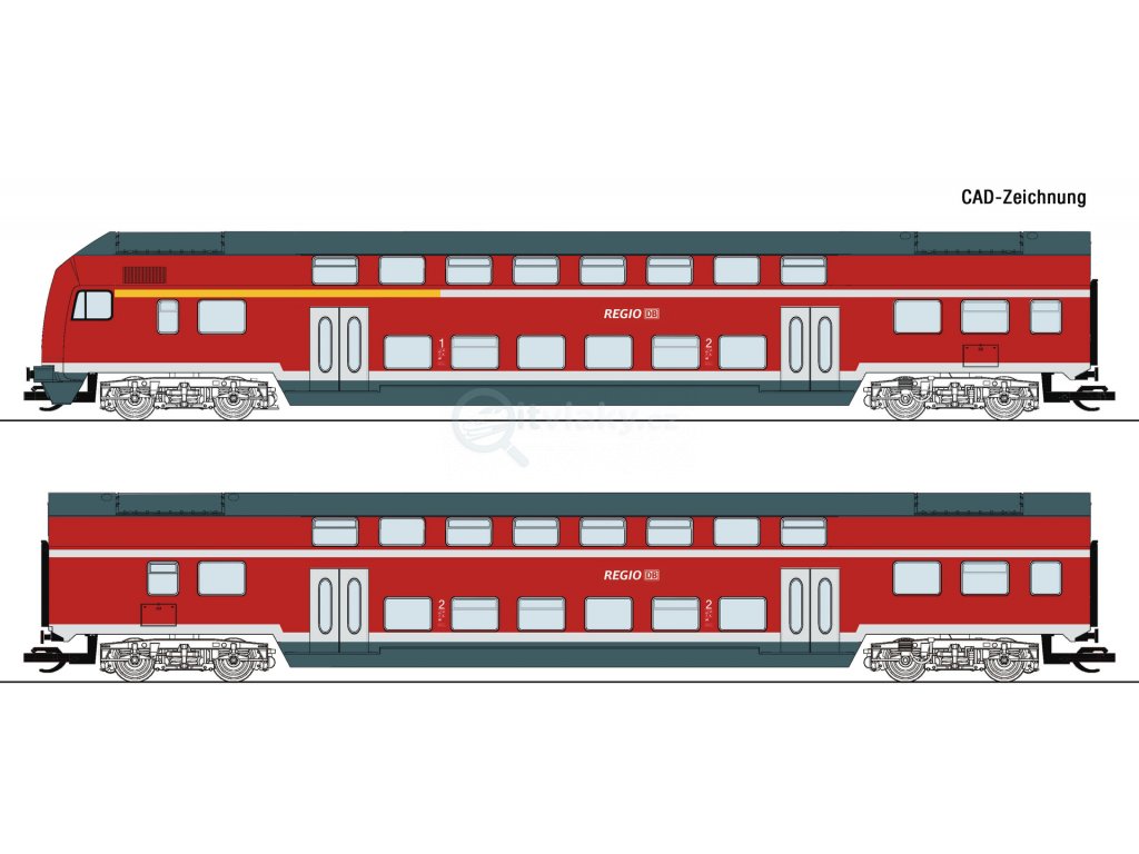 Wagenset 1 mit zwei Doppelstockwagen der Deutschen Bahn. Formvariante! Bestehend aus einem Doppelstockwagen 2. Klasse, Gattung DBuza und einem Doppelstock-Steuerwagen 1./2. Klasse, Gattung DABbuzfa. ■ Zweite Modernisierungsstufe mit neuer Kopfform ■ Außenwandbündige Schwenkschiebetüren und neue Inneneinrichtung ■ Steuerwagen mit Funktionsdecoder für Lichtwechsel weiß/rot im Analog- und Digitalbetrieb ■ Passend zu Doppelstockwagenset, Art.-Nr. 6280009