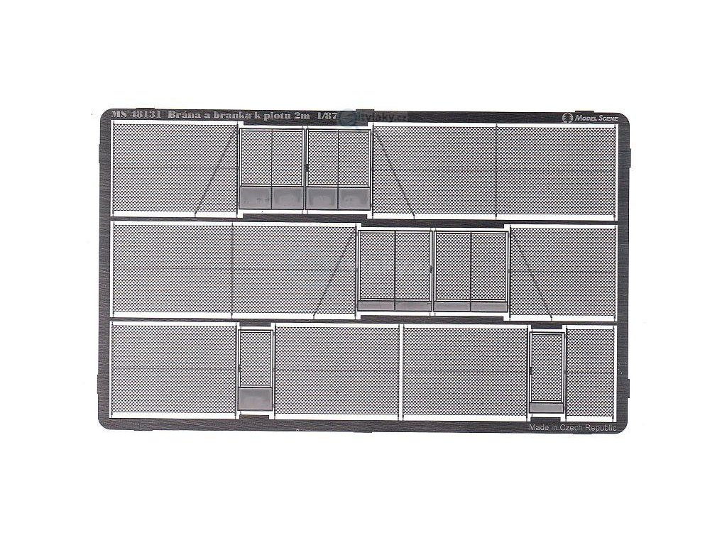 Balení obsahuje brány a branky ke 2 metrovému plotu, součástí je vždy přiléhající plotové ole s opěrnými sloupky. Jedná se o detailní, velmi jemný a plasticky provedený lept, který znázorňuje dokonce výplety jednotlivých ok.