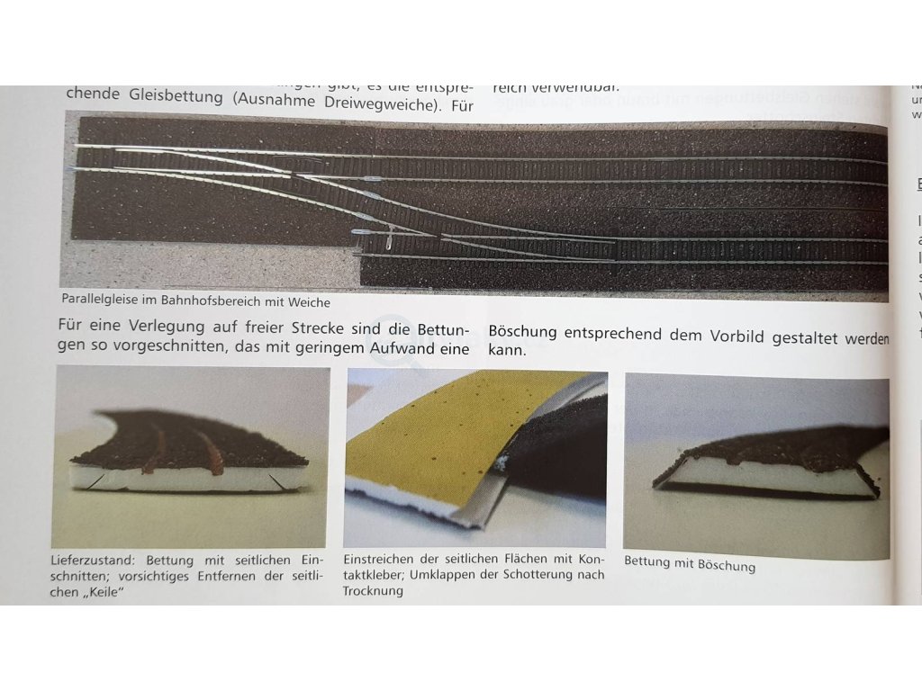 Do štěrbin a vedle štěrkového lože se může dosypat samotný štěrk. Samostatné podloží bez výřezů umožňují opravu vyřezaných dílů a odstranění pole pro pohon výhybek, když jsou výhybky poháněny pod povrchem atd. Přídavný pás pod oblouky umožňuje realistické vyvýšení trati v obloucích.