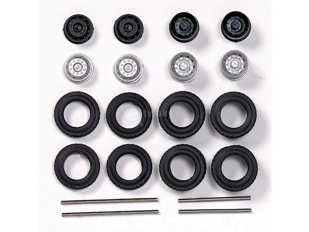 Přestavbová sada pro 2 nákladní nebo hasičské vozy s velkými pneumatikami. Po jedné sadě s ráfky stříbrné barvy s jednoduchými a dvojitými pneumatikami a po jedné sadě s černými ráfky s jednoduchými a dvojitými pneumatikami.