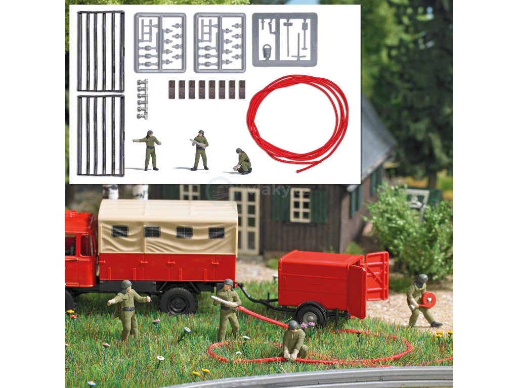 Akční sada pro realistické oživení vašeho modelového světa. 3 hasiči v originálních hasičských uniformách NDR. S požární hadicí (délka 50 cm), hadicovými spojkami a nářadím.