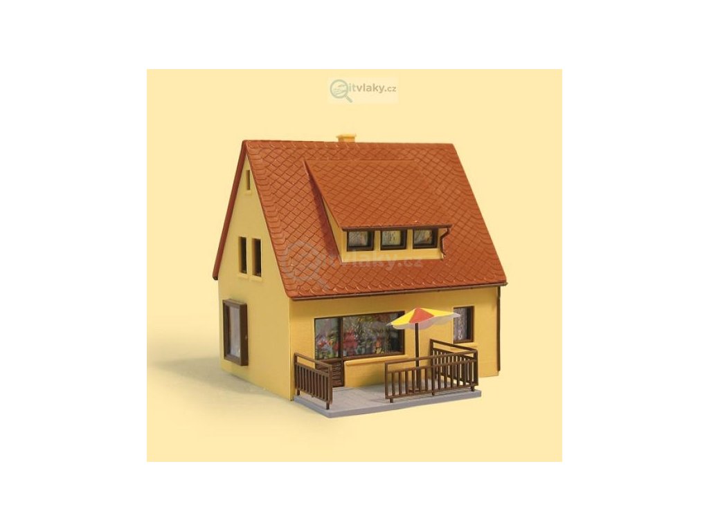 Typický rodinný dům z 60. let. S terasou, slunečníkem a květinovým oknem na štítu. Uzavřený slunečník.