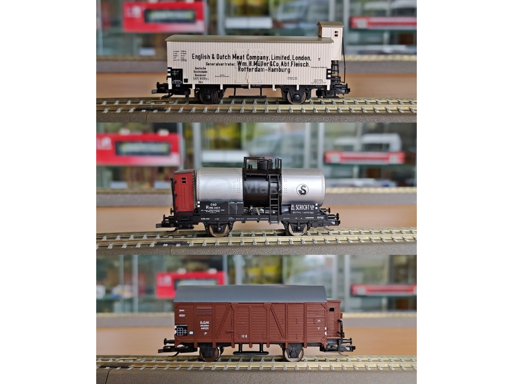TT - Güterwagenset der BDZ, DRG und ČSD, bestehend aus einem gedeckten Güterwagen der BDZ, einem Kühlwagen der DRG und einem Kesselwagen der ČSD,