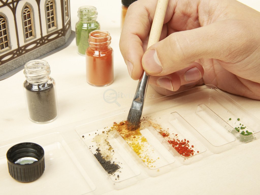 Sada obsahuje sedm různých barev (modrozelená, listově zelená, terakota, rezavě hnědá, písek, popel, saze), pomocí kterých můžete patinovat mosty, domy, vozidla, lokomotivy, vozy, stěny a portály a mnoho dalších. Pigmenty lze vzájemně smíchat a vytvořit tak správnou barvu. To se provádí profesionálně a velmi snadno v omyvatelných míchacích vložkách držáku.