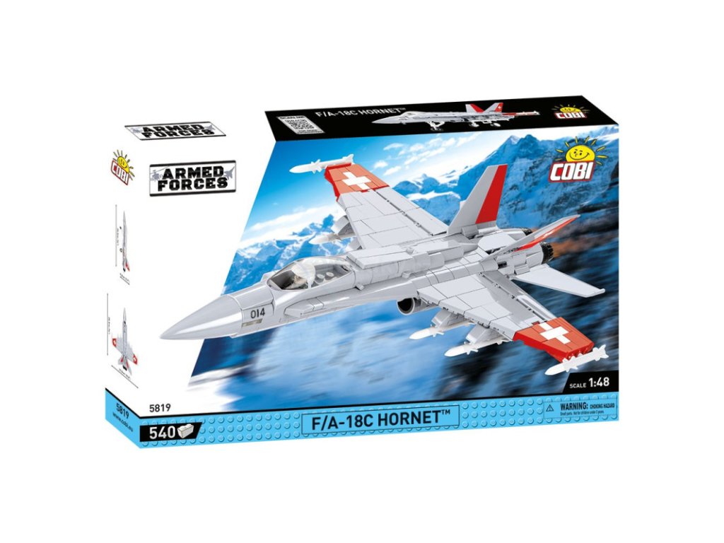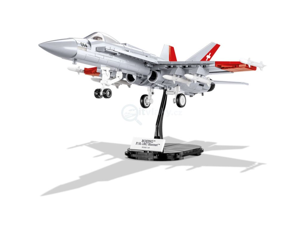 Boeing F/A-18C Hornet™ je americký nadzvukový víceúčelový letoun US Navy, který se vyrábí od roku 1978. Je to jeden z nejmodernějších letounů amerického námořnictva. Letouny F-18 nahradily ve Švýcarsku francouzské stíhačky Mirage IIIS. V roce 1992 byl podepsán kontakt na dodávku 34 jednotek. Objednáno bylo 26 jednomístných letounů C a 8 dvoumístných letounů D. Pouze první dva stroje byly kompletně postaveny v USA. Zbytek byl postaven ve švýcarských závodech RUAG v Emmenu. Do kabiny můžete umístit speciální kostku - půlfigurku pilota. Model je v měřítku 1:48 a sestavený měří 36 x 30 x 11 cm. Balení obsahuje 540 kostek stavebnice.