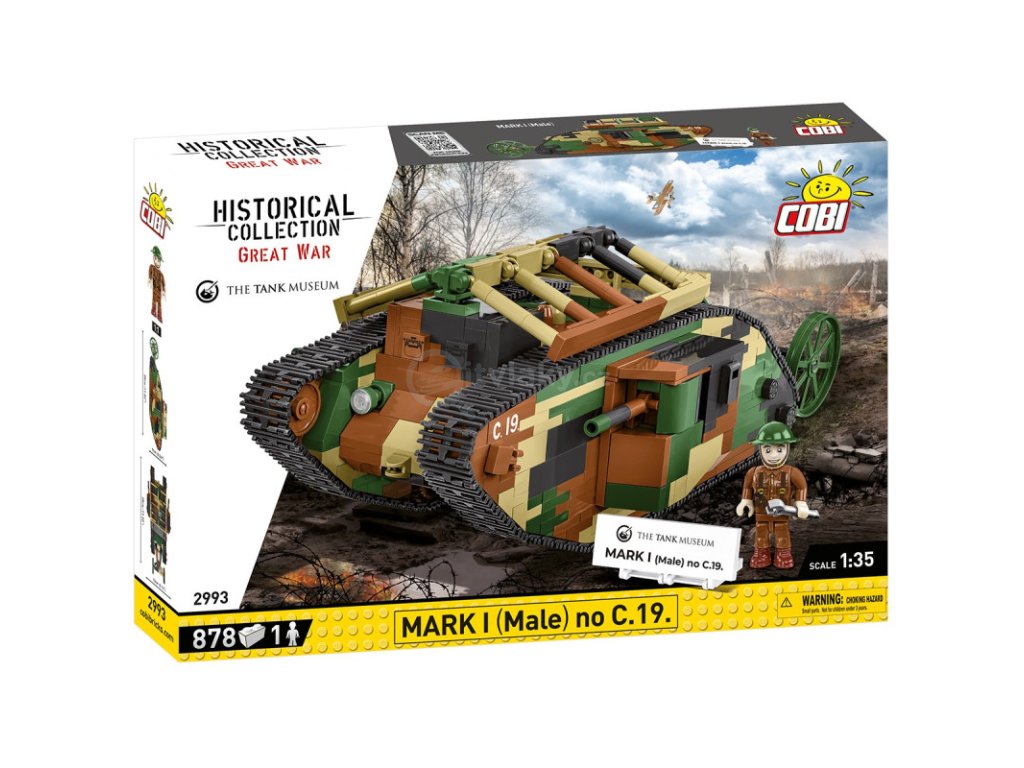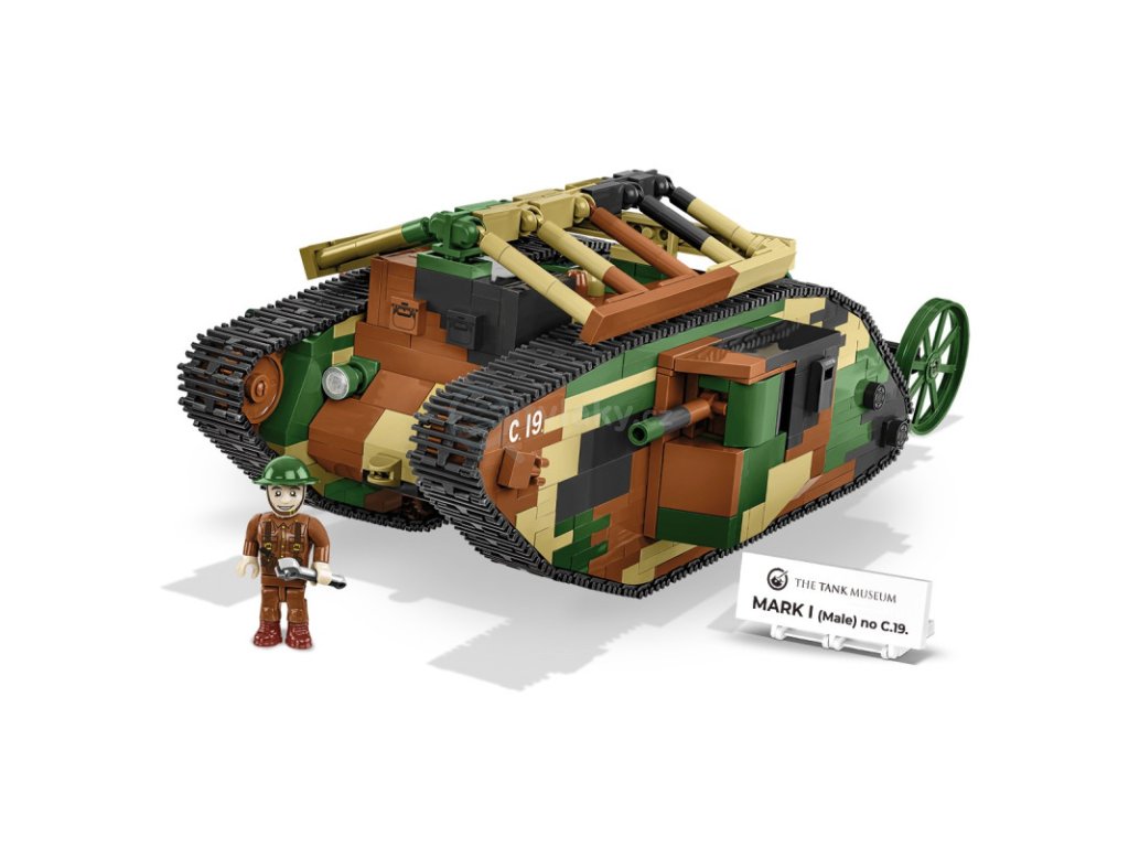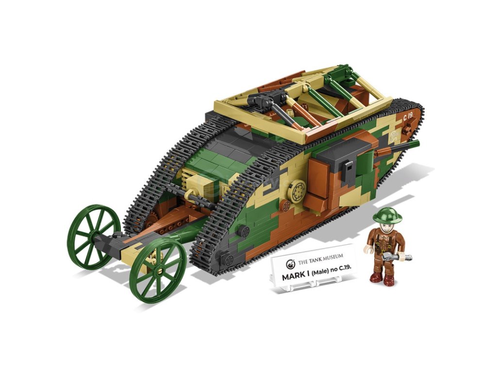 Postavte si model britského tanku Mark I (pánské verze) byl vyroben v roce 1916 během 1. světové války. Byl to jeden z prvních tanků použitých v boji vůbec. Poznámka „pánská verze“ v názvu znamenala, že se jednalo o variantu tanku vybavenou kombinací kanónů umístěných ve věžích na bocích vozidla a kulometů. "Ženská verze" tohoto typu tanků byla vybavena více kulomety. Balení obsahuje 878 kostek stavebnice a 1 figurku vojáka.