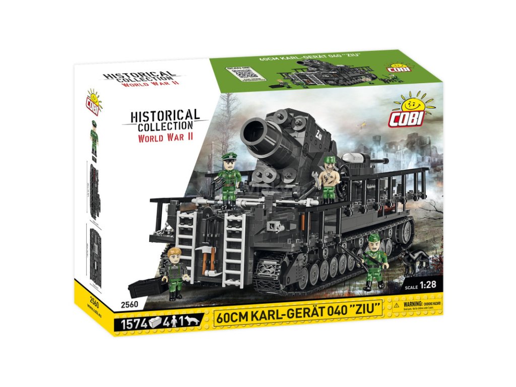 60 cm Karl-Gerät 040 byl nejtěžší samohybný minomet používaný během 2. světové války. Byl vybaven obrovským 60 cm kanónem. Němcům se podařilo vyrobit jen pár exemplářů. Karl Gerät číslo 6 zvaný Ziu byl použit k palbě na Varšavu během varšavského povstání v roce 1944. Model je v měřítku 1:28. Sestavený model měří 40 x 16 x 16 cm. Balení obsahuje 1 574 kostek stavebnice a 5 figurek: 4 figurky německých vojáků a psa polního četnictva.