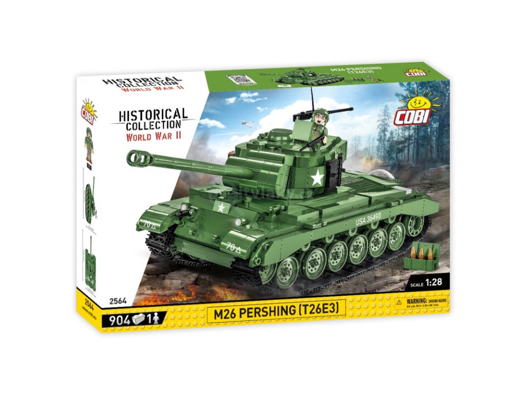 Moderní americké tanky Pershing vyrobené v posledních měsících 2. světové války se vyznačují vysokou účinností. Většinou skončily v armádě generála Pattona, kde odvedly skvělou práci. Výroba tanků začala v roce 1944 a pokračovala až do roku následujícího. Bylo vyrobeno asi 2 200 kusů. Tank byl vybaven pancířem o tloušťce až 102 mm a účinným kanónem M3 ráže 90 mm. Konec 2. světové války neznamenal konec služby tohoto modelu. Tanky šly znovu do bitvy během korejské války v letech 1950-1953. Model je v měřítku 1:28 a sestavený měří 27 x 14 cm. Balení obsahuje 904 kostek stavebnice a figurku vojáka.