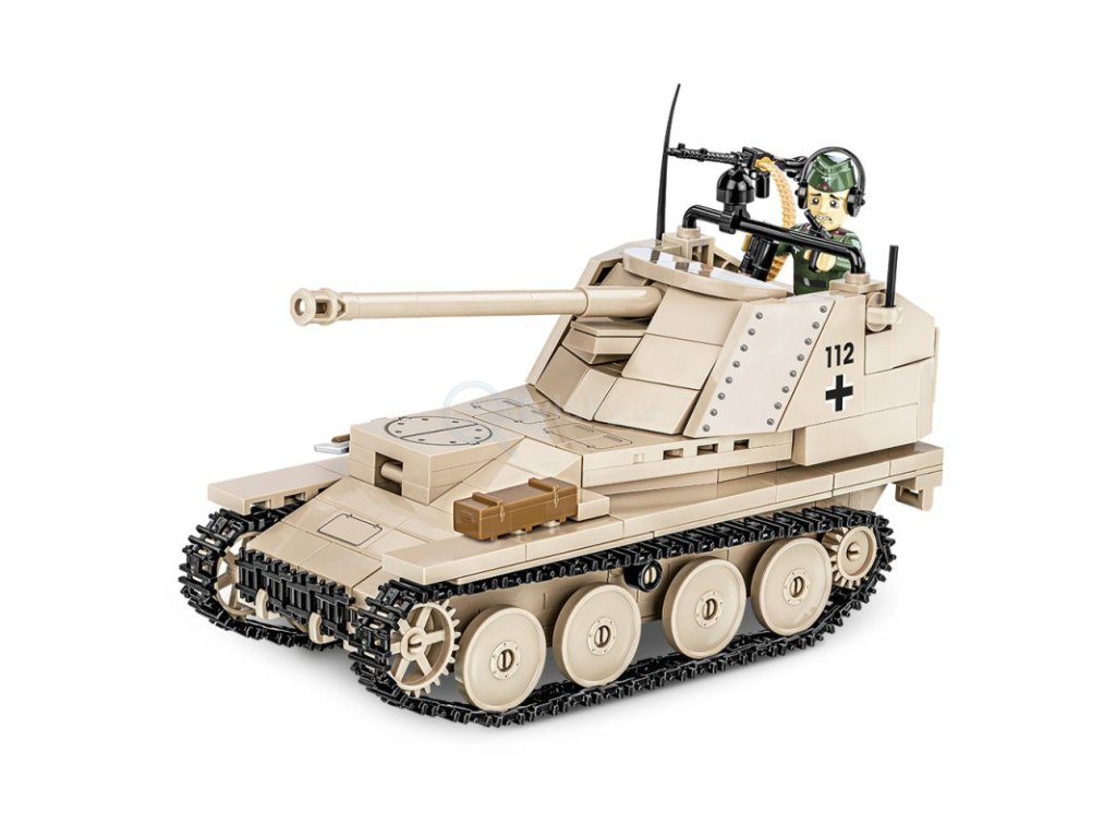 Postavte si model stíhače tanků Marder III, který bojoval na mnoha frontách 2. světové války. Až do zavedení 88 mm děl to byla velmi nebezpečná protitanková zbraň. Design Sd.Kfz. 138 Marder III Ausf. M byl založen na podvozku Panzer 38(t) československé konstrukce, Ausf. M s motorem umístěným uprostřed vozidla. Výzbroj tvořil německý kanon ráže 75 mm se zásobou 27 nábojů. Vozidlo nemělo pevně zabudovaný kulomet. Puška MG 34 nebo MG 42 se nosila v prostoru pro posádku jako volitelná osobní výzbroj. Verze „M“ stejně jako ostatní varianty Marderu neměla střechu zakrývající prostor pro posádku shora. Místo toho došlo k uzavření zadní části prostoru pro posádku.V letech 1943 - 1944 bylo vyrobeno asi 975 exemplářů této varianty Marder III. Celý název vozidla byl Sd.Kfz.138, Panzerjäger 38(t) mit 7,5cm PaK40/3 Ausf. m. Balení obsahuje 367 kostek stavebnice a 1 figurku.