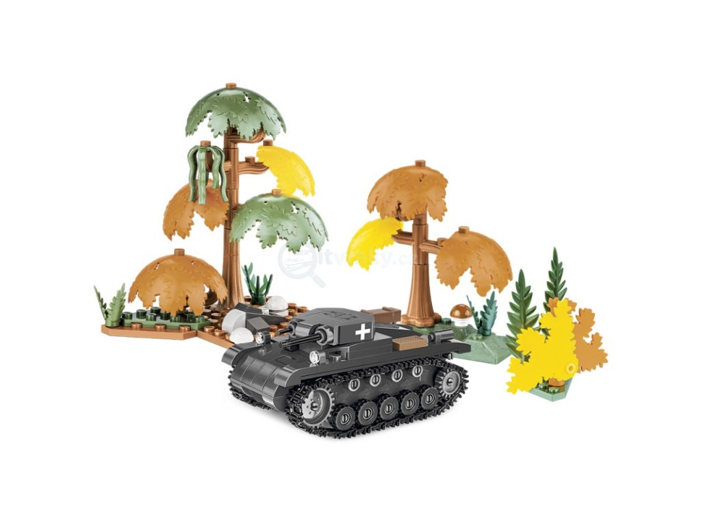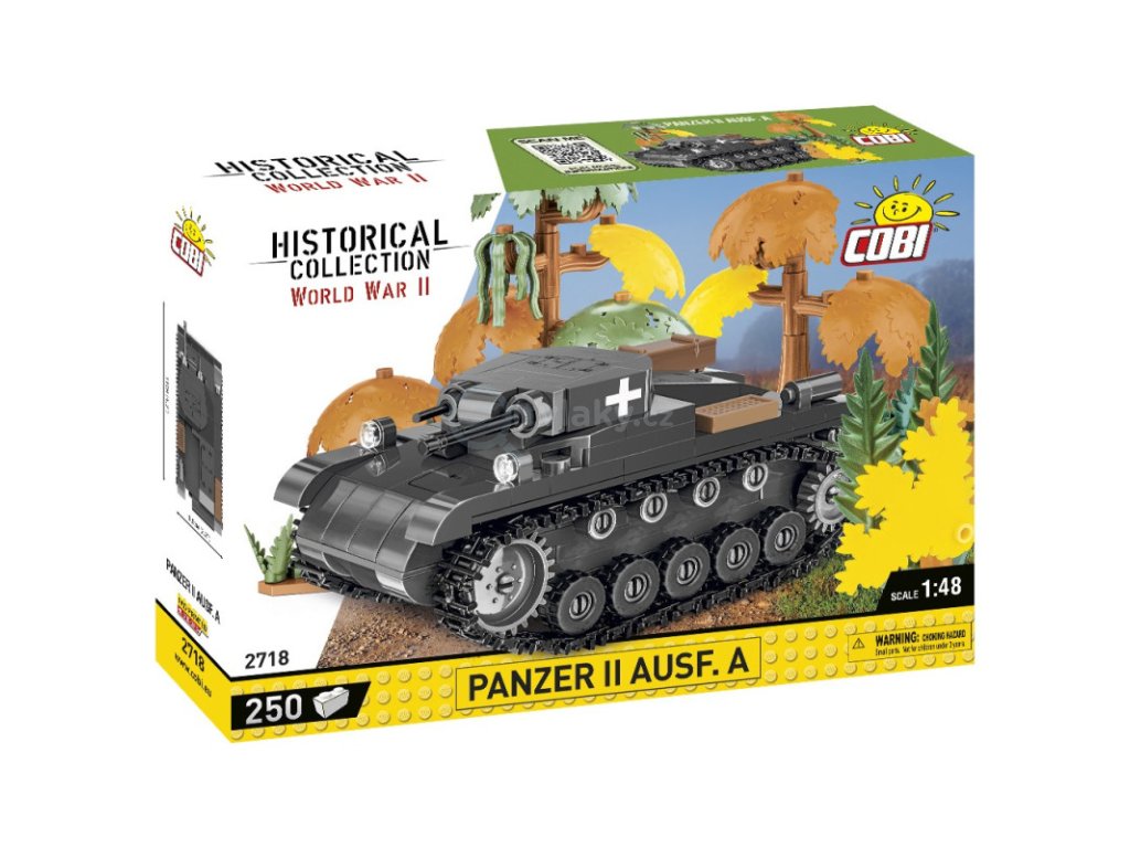 Panzerkampfwagen II je německý lehký tank používaný v prvních letech 2. světové války. Do roku 1941 byl základním tankem u obrněných divizí. Od roku 1942 kvůli slabosti výzbroje ztratil na významu. Sloužil k průzkumným a protipartyzánským úkolům. Bylo vytvořeno několik verzí PzKpfw II, které byly používány až do konce války. Náš model je v měřítku 1:48 a sestavený měří 11 x 5 cm. Balení obsahuje 250 kostek stavebnice, neobsahuje figurky.