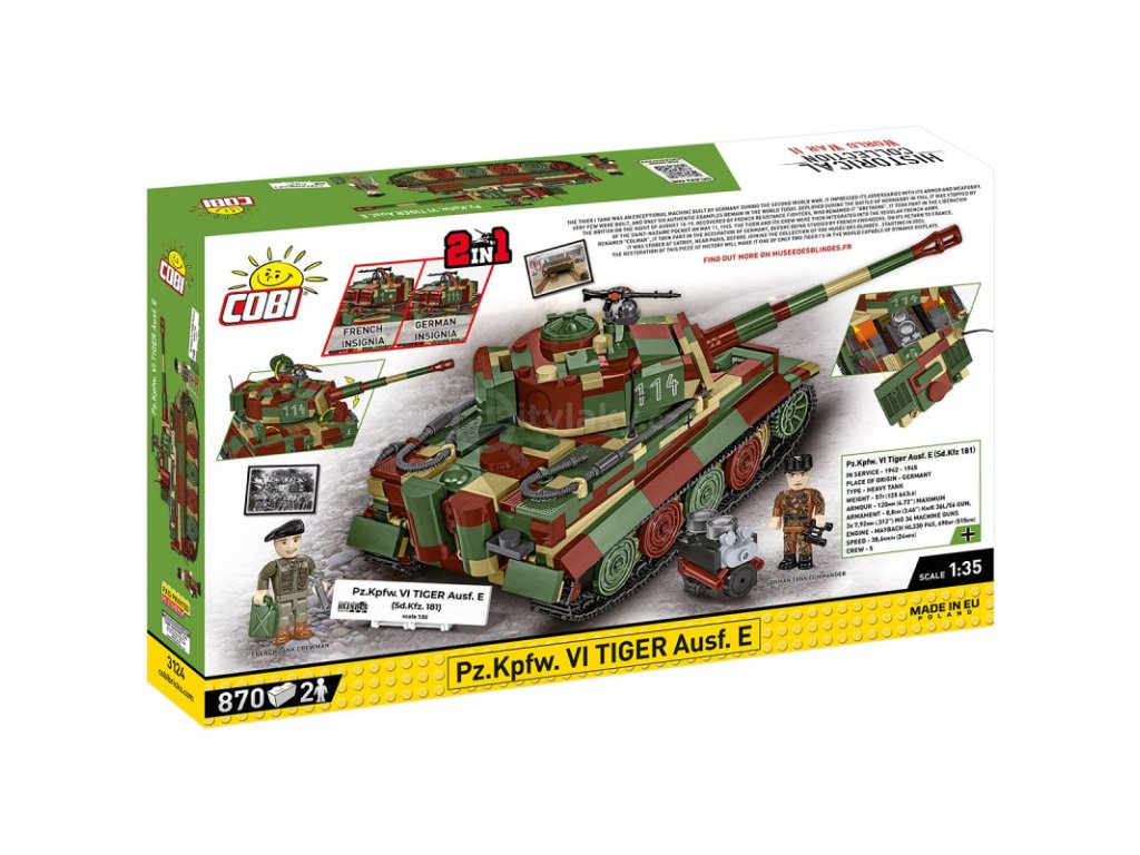 Postavte si model Pz.Kpfw. VI „Tiger“ s číslem strany 114, který se nachází v Musée des Blindés ve francouzském Saumuru, je jedním z nejcennějších exponátů tohoto muzea. Tanky Tiger byly jedním z nejznámějších a nejnebezpečnějších obrněných strojů používaných Německem během druhé světové války. Proslavily se silnou výzbrojí, zejména kanónem ráže 88 mm, a silnou pancéřovou ochranou. Tento konkrétní exemplář s číslem 114 je jedním z mála dochovaných na světě, což jej činí mimořádně cenným jak historicky, tak technologicky. Tento tank se zúčastnil bojů a byl převzat spojenci. Po opravách zahájila službu ve francouzské armádě s vlastním jménem „Bretagne“. Balen9 obsahuje 870 kostek a 2 figurkz.