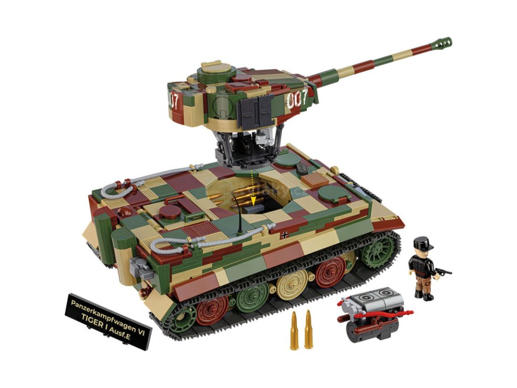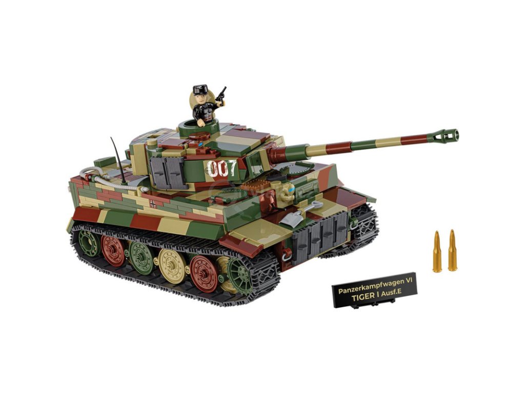 Postavte si model Panzerkampfwagen VI neboli Tiger německý těžký tank z druhé světové války. Jeho charakteristický tvar je dodnes rozpoznatelný po celém světě. Samotné vozidlo se stalo legendou a je stále přítomné nejen v historických materiálech, ale i v popkultuře. První jednotky Tiger byly dodány na frontu poblíž Leningradu a Tuniska v srpnu/září 1942. Tank navržený a vyrobený firmou Henschel byl velmi moderní a účinný. Bohužel jeho výroba spotřebovala obrovské zdroje cenných surovin a času. Tiger I a několik tanků Tiger II měly významný vliv na průběh nepřátelských akcí. Nechvalně známé a děsivé tygři zničili přes 10 300 spojeneckých tanků a 11 380 děl s vlastními ztrátami 1 725. Balení obsahuje 1207 kostek a 1 figurku.