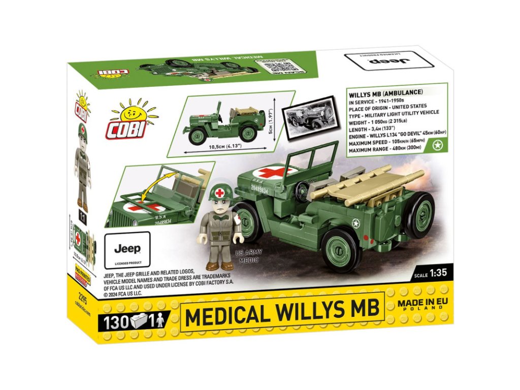 Postavte si model Jeepu Willys MB v provedení sanitky v měřítku 1:35, vydaný u příležitosti 80. výročí Vylodění v Normandii (D-Day). Sestavený model měří 10,5 x 6 x 5 cm. Balení obsahuje 130 kostek stavebnice a figurku vojenského zdravotníka.