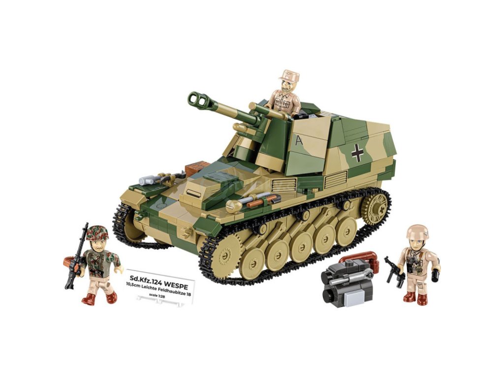 Postavte si model německého samohybného děla Wespe. Připojuje se do rodiny vozidel založených na podvozku tanku Panzer II. Byl vyzbrojen houfnicí leFH 18/2 ráže 10,5 cm, což z něj činilo účinnou dělostřeleckou podporu německých obrněných jednotek Wespe byl zaveden do výzbroje v roce 1943 a byl používán na východní a západní frontě. Díky své pohyblivosti mohl rychle měnit polohu, což jej chránilo před nepřátelskými protiútoky. Byly vyrobeny v omezeném počtu, ale získaly uznání pro svou účinnost a spolehlivost v roli mobilního dělostřelectva. Balení obsahuje 860 kostek a 3 figurky.