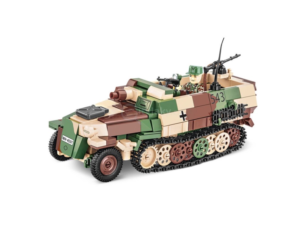 Sd.Kfz.251 je základní polopásový obrněný transportér německé armády během 2. světové války. Výroba různých verzí probíhá již od roku 1939. Na jeho základě byla postavena i další bojová vozidla. Jedním z nich byl „Stummel“ vybavený krátkohlavňovým 7,5 cm kanónem Stu.K.37 75 mm, který byl vytvořen jako vozidlo palebné podpory. První vozidla tohoto typu byla vyrobena v roce 1942. Náš model "Stummel" je vyroben v měřítku 1:35. Všimněte si krásné barevné kamufláže. Vozidlo je vybaveno pohyblivými koly se skutečnými pneumatikami a dalšími funkčními částmi jako jsou otevírací zadní dveře nebo pohyblivé dělo. Sadu doplňuje figurka představující obrněného granátníka s oboustrannými potisky a kostka s názvem vozidla. Balení obsahuje 485 kostek stavebnice a 1 figurku.