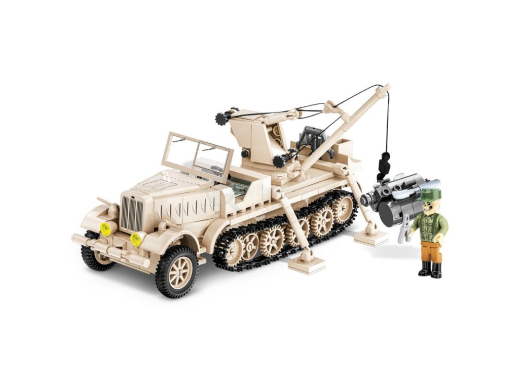 Postavte si model Sd.Kfz. 9/1 „FAMO“, což bylo největší z rodiny německých polopásových vozidel z 2. světové války. Byl konstruován jako těžký dělostřelecký tahač, ale jeho provoz ve válečných podmínkách mu dal jiné úkoly. Vozidlo bylo využíváno především v opravárenských jednotkách a sloužilo k evakuaci obrněných vozidel. jak se obrněné zbraně vyvíjely, byly stále těžší, takže musely být taženy dvěma nebo dokonce třemi vozidly tohoto typu. Famo byl poháněn motorem Maybach HL 108. Stejné pohonné jednotky byly instalovány v prvních verzích Pz. Kpfw. III a IV. Tahač verze 9/1 byl vybaven šestitunovým jeřábem Bildstein. Balení obsahuje 498 kostek stavebnice a 1 figurku vojáka.