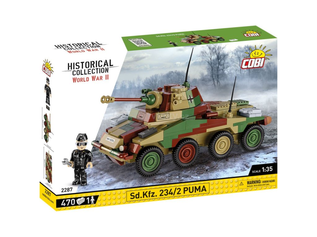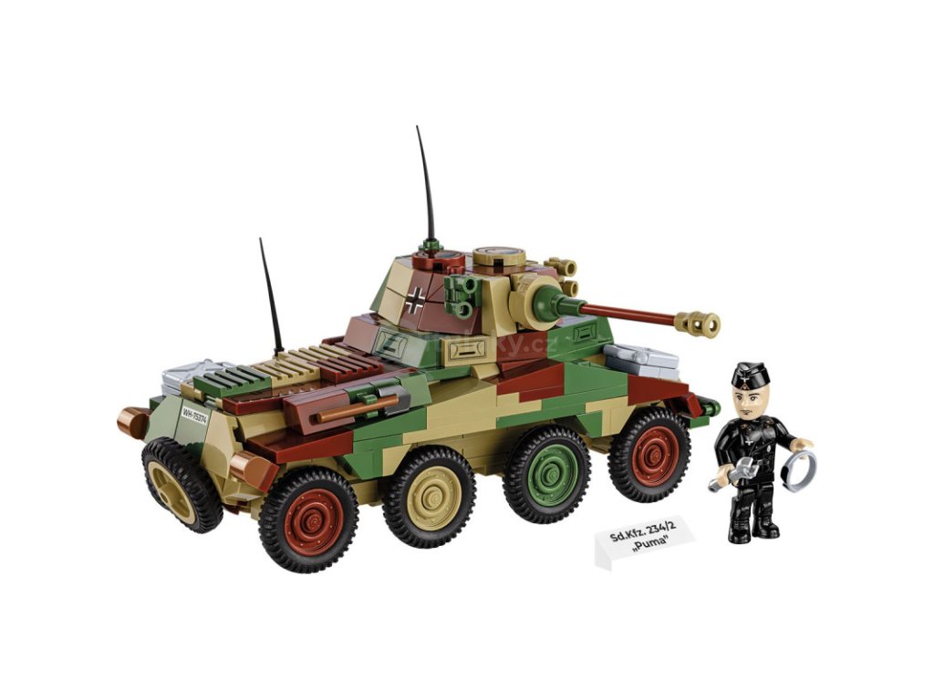 Postavte si model Sd. Kfz. 234/2 Puma. Jedná se o německé obrněné kolové vozidlo používané během 2. světové války. Bylo vybaveno 50mm kanónem umístěným v plně pancéřované věži. Od září 1943 do září 1944 bylo vyrobeno 101 těchto vozidel. Vůz měl dieselový motor Tatra 103 a dosahoval maximální rychlosti až 90 km/h. V terénu si vedl téměř stejně dobře jako pásová vozidla. Balení obsahuje 470 kostek stavebnice a 1 figurku vojáka. Model je v měřítku 1:35.
