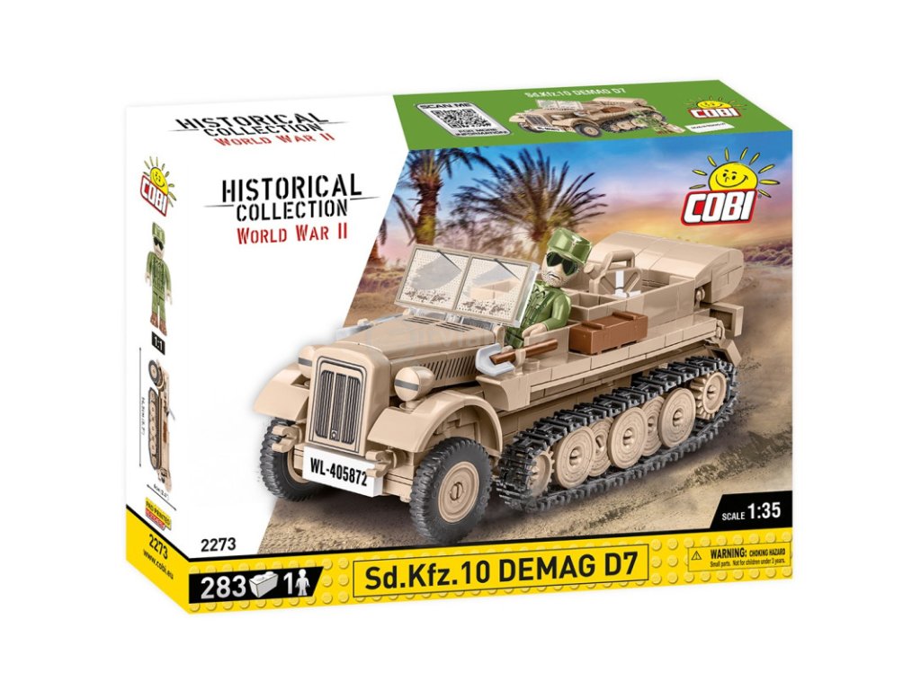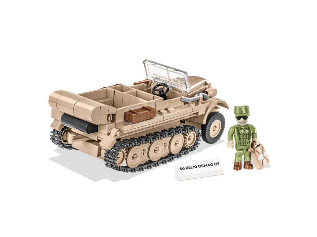 Sd.Kfz.10 DEMAG D7 byl lehký, polopásový dělostřelecký tahač vyráběný v letech 1937 - 1945 pro potřeby německé armády. V závislosti na verzi mohl přepravovat 2 členy posádky a 6 cestujících. Byl to základní tahač používaný v motorizovaném dělostřelectvu. O oblíbenosti vozu svědčí i počet vyrobených kusů dosahujících čísla 17 000. Vozidlo je v měřítku 1:35. Balení obsahuje 283 kostek stavebnice a figurku vojáka.