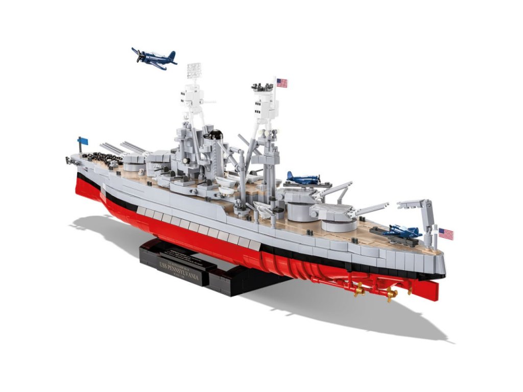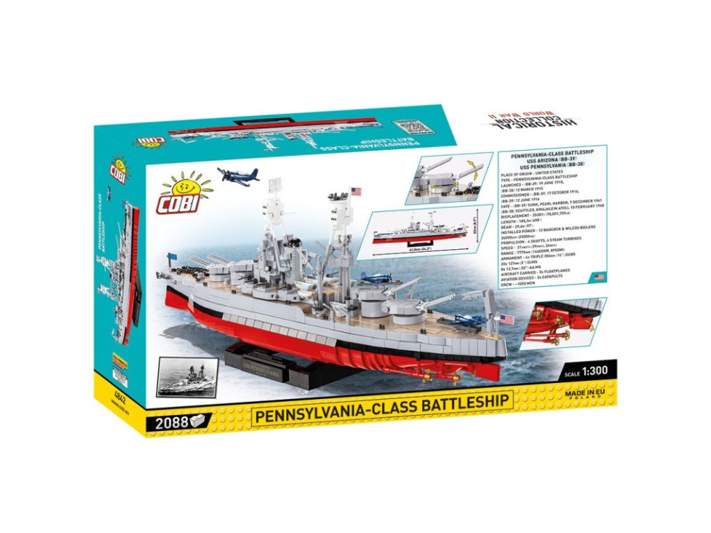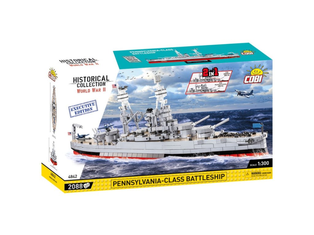 EXECUTIVE EDITION s loděmi třídy Pennsylvania nabízí dva způsoby, jak postavit historickou bitevní loď třídy Pennsylvania! S přiloženými extra kostkami se značkami a částmi vybavení si můžete vybrat, zda postavíte USS Pennsylvania nebo USS Arizona! Loď byla navržena v měřítku 1:300 a na délku měří celých 61,5 cm! Verze Executive obsahuje také cihlový stojan, na který můžete připevnit černé štítky s technickými údaji a názvem lodi. Balení obsahuje 2088 kostek.
