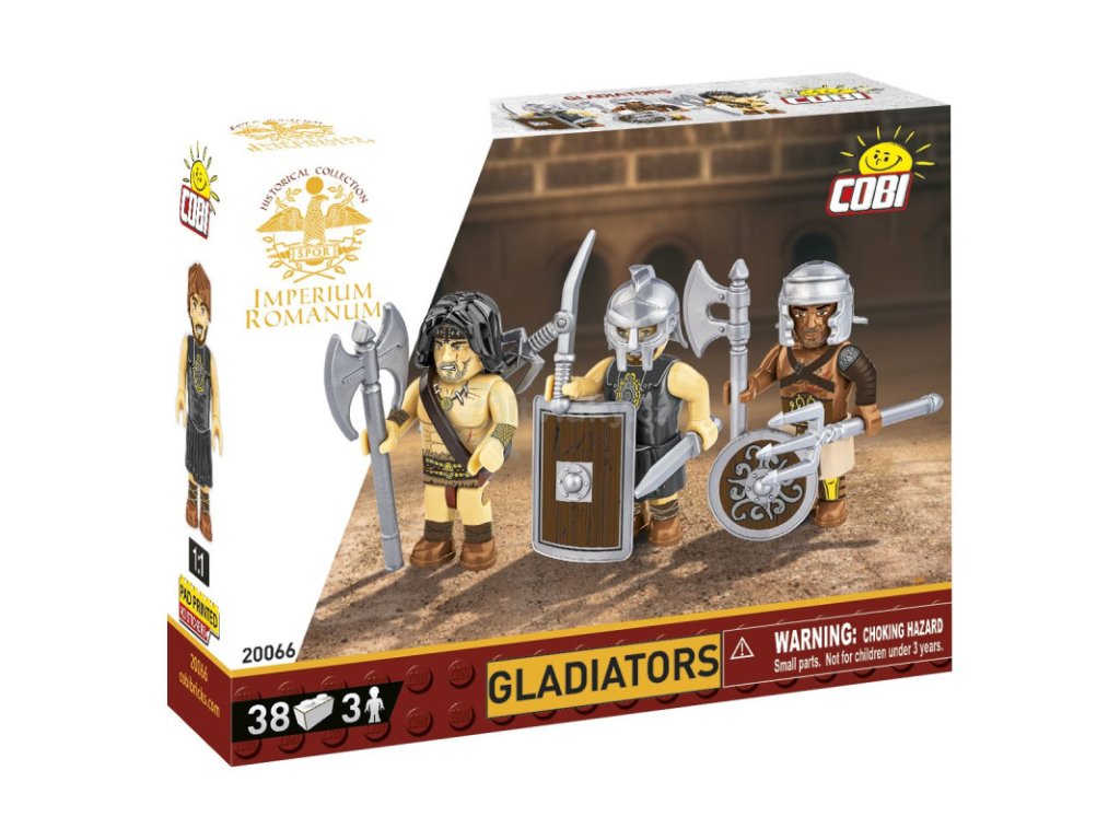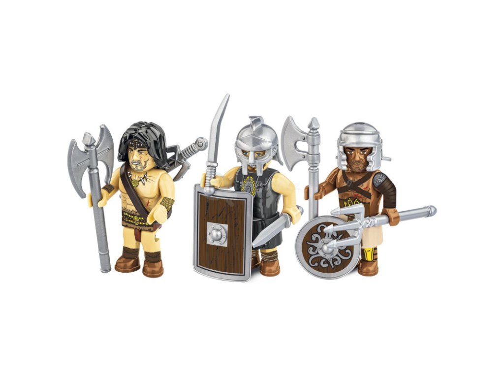 Sada tří figurek znázorňujících odvážné gladiátory se zcela novými doplňky a krásnými potisky! Mezi těmito statečnými válečníky jistě najdete hrdiny mimořádných příběhů! Doplňte figurky z kolekce Roman Empire. Vyměňte mezi nimi zbraně, pokrývku hlavy a štíty. Vytvořte si vlastní kombinaci válečných barbarů a gladiátorů. Figurky jsou skvělým doplňkem k sadě "Gladiator School". Začněte budovat tréninkové a bojové scény. Jako Spartakus zahajte povstání proti Římanům a bojujte proti bezpočtu legií Impéria! Budujte historii, cihlu po cihle! Balení obsahuje 38 kostek a 2 figurky.